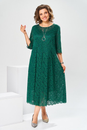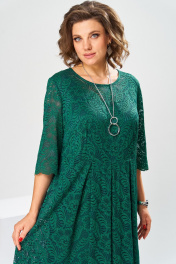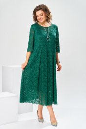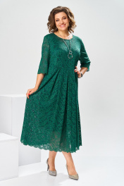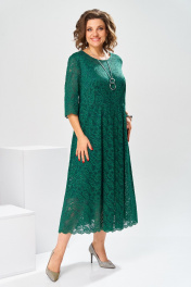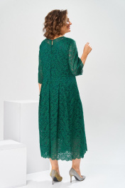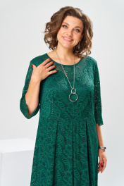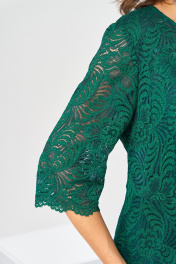 Платье женское отрезное по линии талии, предназначено для торжественного выхода. Перед: верхняя часть с двумя талиевыми вытачками, нижняя часть с тремя встречными бантовыми складками. Горловина круглая, обтачная, без воротника. Застежка на 7 пришивных пуговиц в среднем шве спинки. Рукав втачной, одно шовный, длиной 3/4. Платье на подкладке с плечевыми накладками. Длина спинки 120 см . Длина рукава 39 см