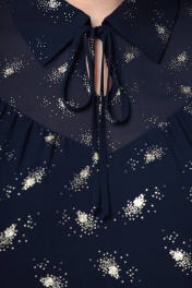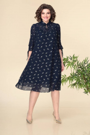 Платье женское предназначено для повседневной носки. Платье расширенное к низу, длиной за колено. Перед с отрезной кокеткой по шву соединения с кокеткой перед с легкой сборкой. Спинка с отрезной кокеткой из отделочной ткани. Горловина круглая, с втачным воротником рубашечного типа с отрезной стойкой, на горловине кокетки обработан разрез -капелька- косой бейкой, фиксирующийся на завязки. Рукав втачной, одно шовный, длиной 3/4. Окат рукава со сборкой. Низ рукава с разрезом-капелька, обработанным косой бейкой и кулисой с завязкой, регулирующей ширину низа рукава. Платье на подкладке. Платье с плечевыми накладками. Длина спинки и105см. Длина рукава 42см