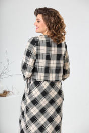 Платье женское полуприлегающего силуэта, длиной ниже колена на 10см предназначено для повседневной носки. Лиф платья отлетной, перед с двумя нагрудными вытачками, спинка цельнокроенная. Лиф платья на подкладке, к которой крепится нижняя часть платья. Переднее полотнище с карманами в боковых швах, заднее с двумя талиевыми вытачками. Горловина круглая, обтачная, без воротника. Рукав втачной, длиной 3/4, одно шовный. Платье с плечевыми накладками. Длина спинки 112см. Длина рукава 43см