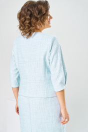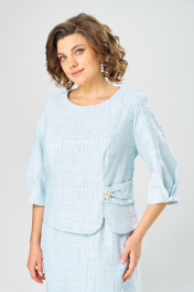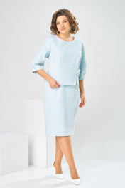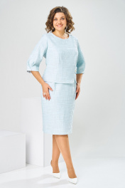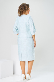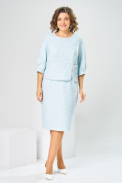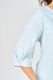 Платье женское, относится к нарядной торжественной одежде. Платье женское полу прилегающего силуэта, длиной за колено, выполнено в виде имитации костюма. Лиф платья отлетной. Перед с 2-мя отрезными бочками, левый бочок с отделочным фигурным поясом, декорированным объёмным украшением, шов притачивания левого бочка с разрезом с закруглёнными концами. Спинка лифа со средним швом и 2-мя отрезными бочками. Лиф платья на подкладке, к которой крепится нижняя часть платья (юбка). Переднее полотнище нижней части с 2-мя таллиевыми вытачками. Заднее полотнище с 2-мя таллиевыми вытачками и средним швом, заканчивающимся шлицей. Нижняя часть платья на подкладке. Горловина круглая, обтачная, без воротника. Застёжка на потайную тесьму-молнию в среднем шве спинки. Рукав втачной, одно шовный, длиной 3/4. Низ рукава со встречной складкой, обточной, складка декорирована пришивной пуговицей. Платье с плечевыми накладками. Длина спинки 104 см, длина рукава 42 см.
