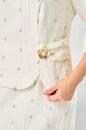 Платье женское, относится к нарядной торжественной одежде. Платье женское полу прилегающего силуэта, длиной за колено, выполнено в виде имитации костюма. Лиф платья отлетной. Перед с 2-мя отрезными бочками, левый бочок с отделочным фигурным поясом, декорированным объёмным украшением, шов притачивания левого бочка с разрезом с закруглёнными концами. Спинка лифа со средним швом и 2-мя отрезными бочками. Лиф платья на подкладке, к которой крепится нижняя часть платья (юбка). Переднее полотнище нижней части с 2-мя таллиевыми вытачками. Заднее полотнище с 2-мя таллиевыми вытачками и средним швом, заканчивающимся шлицей. Нижняя часть платья на подкладке. Горловина круглая, обтачная, без воротника. Застёжка на потайную тесьму-молнию в среднем шве спинки. Рукав втачной, одно шовный, длиной 3/4. Низ рукава со встречной складкой, обточной, складка декорирована пришивной пуговицей. Платье с плечевыми накладками. Длина спинки 104 см, длина рукава 42 см.