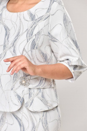 Платье женское, относится к нарядной торжественной одежде. Платье женское полу прилегающего силуэта, длиной за колено, выполнено в виде имитации костюма. Лиф платья отлетной. Перед с 2-мя отрезными бочками, левый бочок с отделочным фигурным поясом, декорированным объёмным украшением, шов притачивания левого бочка с разрезом с закруглёнными концами. Спинка лифа со средним швом и 2-мя отрезными бочками. Лиф платья на подкладке, к которой крепится нижняя часть платья (юбка). Переднее полотнище нижней части с 2-мя таллиевыми вытачками. Заднее полотнище с 2-мя таллиевыми вытачками и средним швом, заканчивающимся шлицей. Нижняя часть платья на подкладке. Горловина круглая, обтачная, без воротника. Застёжка на потайную тесьму-молнию в среднем шве спинки. Рукав втачной, одно шовный, длиной 3/4. Низ рукава со встречной складкой, обточной, складка декорирована пришивной пуговицей. Платье с плечевыми накладками. Длина спинки 104 см, длина рукава 42 см.