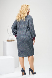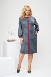Платье предназначено для повседневной носки. Платье женское полу прилегающего силуэта, длиной ниже колена. Перед с отрезной кокеткой, с 2-мя нагрудными вытачками, с притачной вертикальной планкой по центру из отделочной ткани. Спинка с 2-мя таллиевыми вытачками. В боковых швах обработаны карманы. Горловина круглая с втачной планкой из отделочной ткани. Платье со спущенным плечом. Рукав втачной, длинный, одно шовный, низ рукава со сборкой и притачной манжетой из отделочной ткани. Перед платья декорируются пришивной металлической пластиной. Платье без плечевых накладок. Длина спинки 104 см. Длина рукава 55 см, длина рукава от плеча 67 см.
