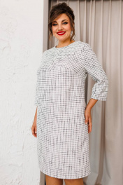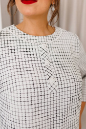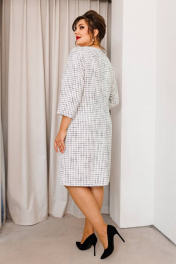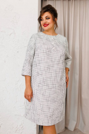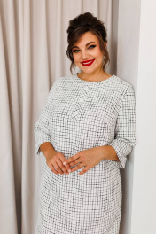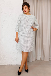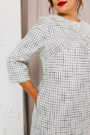 Платье женское, предназначено для повседневной носки. Платье женское А-силуэта, длиной за колено. Перед с 2-мя нагрудными вытачками, с надстрочной вертикальной планкой, декорированной 3-мя пришивными пуговицами, с отрезной притачной планкой по горловине, шов притачивания декорирован отделочной тесьмой с бусинами. Спинка с 2-мя таллиевыми вытачками и средним швом. Платье с карманами в боковых швах. Горловина круглая, обточная, без воротника. Застёжка на потайную тесьму-молнию в среднем шве спинки. Рукав втачной, 2х шовный, длиной 3/4. Платье на подкладке. Платье с плечевыми накладками. Длина спинки платья 98 см. Длина рукава 48 см.