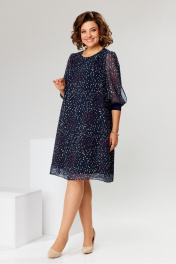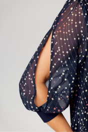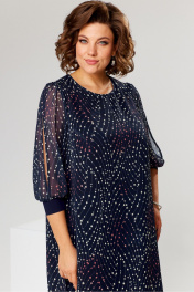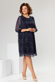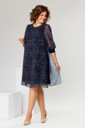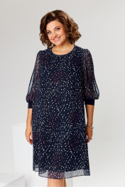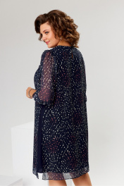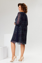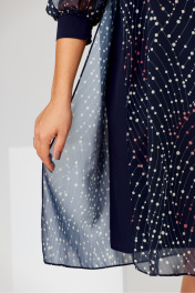 Платье женское, относится к коктейльным платьям. Платье женское, А-силуэта, длиной за колено. Перед с 2-мя нагрудными вытачками, выходящими из проймы. Спинка вверху по горловине с обтачным разрезом, фиксирующимся на 1-ну навесную петлю и 1-ну пришивную пуговицу. Горловина круглая, обтачная, без воротника. Боковые швы с очень высокими разрезами. Рукав втачной, двух шовный, длиной 7/8, с притачной манжетой из отделочной ткани, частично собранной на эластичную тесьму; верхний шов с высоким разрезом. По окату рукава и низу рукава лёгкая сборка. Платье на подкладке из текстильной отделочной ткани. Платье без плечевых накладок. Длина спинки платья 100 см, Длина рукава 50 см.