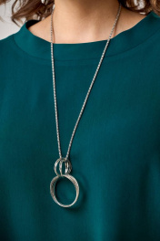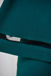 Костюм женский, относящийся к нарядной одежде, но может использоваться и при повседневной носке. Костюм женский, 2-х предметный, блузон и брюки. Блузон женский, прямого силуэта с ассиметричным низом. Перед и спинка с горизонтальным подрезом, с декоративной приточной планкой из отделочной ткани. Горловина круглая с втачной стойкой. Рукав цельнокроеный "летучая мышь", длиной 3/4 с приточной отложенной манжетой. Блузон без плечевых накладок. Брюки женские, прямые, длинные. Передние половинки с карманами в боковых швах. Задние половинки с таллиевыми вытачками. Брюки с притачным поясом, собранном на эластичную тесьму на уровне задних половинок (по спинке), закреплённую отделочной строчкой. К костюму прилагается съёмное украшение. Длина спинки блузона 76 см, Длина брюк по боковому срезу 104 см.