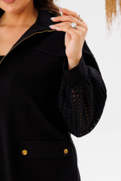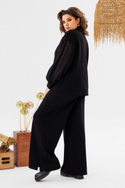 Костюм предназначен для повседневной носки. Костюм женский 2-х предметный жакет брюки. Жакет женский прямого силуэта, длиной ниже линии бёдер. Перед с 2-мя отрезными кокетками, с 2-мя прямоугольными накладными карманами, фиксирующимся к карманам на металлические кнопки. Спинка цельнокроеная. Горловина круглая с втачной стойкой. Застёжка центральная бортовая на разъёмную тесьму-молнию. Жакет со спущенным плечом. Рукав втачной из отделочной ткани с притачной планкой по центру, длинный, низ рукава со сборкой и притачной манжетой. Жакет без плечевых накладок. Брюки женские длинные прямые. Передние половинки с карманами в боковых швах, с декорированными защипами по центру шириной 0,5 см. Задние половинки с таллиевыми вытачками. Боковые швы с разрезами. Брюки с притачным поясом, собранным на эластичную тесьму, закреплённую 2-мя отделочными строчками. Длина спинки жакета 62 см, длина рукава 51 см, ширина плеча 24 см. Дина брюк по боковому срезу 102 см.