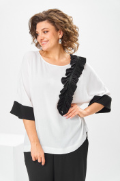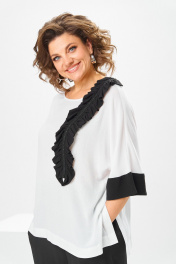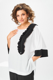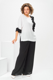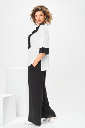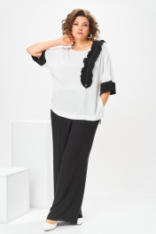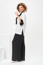 Костюм женский, 2-х предметный, блузка и брюки. Блузка женская, прямого силуэта, длиной ниже линии бёдер, с фигурным низом "ступенька". Перед цельнокроенный, с настрочным декором слева, с настрочной отделочной тесьмой. Спинка цельнокроенная. Горловина круглая, обточная, без воротника, длиной до локтя с притачной манжетой из отделочной ткани. Боковые швы с разрезами. Блузка без плечевых накладок. Брюки женские, прямые, длинные. Передние половинки с карманами в боковых швах. Задние половинки без конструктивных особенностей. Брючки с притачным поясом, собранным на эластичную тесьму (частично) и закреплённую 2-мя отделочными строчками. Длина спинки блузки 68,5 см, длина рукава 49 см. Длина брюк 105 см.