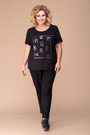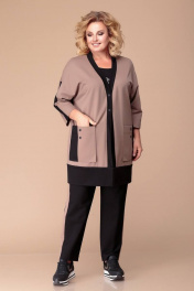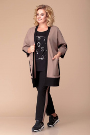 Комплект женский трех предметный: кардиган, майка и брюки предназначен для повседневной носки. Кардиган женский прямого силуэта. Перед с двумя прямоугольными накладными карманами на уровне линии бедер. Спинка со средним швом. Горловина с V-образным вырезом, по краю горловины и краю борта притачная планка. Застежка центральная на две металлических кнопки. Низ кардигана с горизонтальной притачной планкой. Кардиган со спущенной проймой. Рукав втачной , длиной 3/4 с вертикальной планкой по центру. Майка женская полуприлегающего силуэта, длиной до линии бедер. Перед с двумя нагрудными вытачками декорирован принтом. Спинка цельнокроенная. Горловина круглая с втачной планкой. Рукав втачной, короткий, одно шовный. Брюки женские свободные, длинные. Передние половинки с карманами в боковых швах. Задние половинки с талиевыми вытачками. Боковые швы с вертикальными притачными планками. Верхний срез брюк с притачным поясом, собранным на эластичную тесьму и декоративный шнурок. Длина кардигана 83 см. Длина рукава от горловины 59 см. Длина майки 63 см. Длина рукава майки 22 см. Длна брюк 100 см.