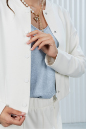 Элегантный белый костюм с топом серого цвета Этот стильный и универсальный костюм станет отличным дополнением вашего гардероба! Он идеально подходит для создания элегантных и современных луков, сочетая в себе комфорт, лаконичность и изысканность. Такой костюм отлично впишется в офисный стиль, деловые встречи или вечерние мероприятия. Цвет: чистый белый, который добавляет образу свежесть и универсальность; Дизайн: укороченная куртка с длинными рукавами и застёжкой на пуговицы. Лаконичный крой и минималистичный стиль придают изделию элегантность; Материал: качественная и приятная на ощупь ткань, которая обеспечивает комфорт и сохраняет форму в течение всего дня. Описание брюк: Цвет: белый, гармонично сочетающийся с курткой; Дизайн: брюки прямого кроя с высокой посадкой и длиной до щиколотки. Они подчеркивают стройность силуэта и добавляют образу стиль; Материал: мягкая и плотная ткань, которая обеспечивает комфорт и отлично держит форму. С чем носить: Костюм отлично дополнят туфли на каблуке или стильные сандалии, как на фото. Для завершения образа подойдут минималистичные аксессуары, такие как тонкая цепочка, серьги или солнцезащитные очки. Уход за изделием: Куртку и брюки рекомендуется стирать в деликатном режиме при температуре до 30°C или отдавать в химчистку. Топ можно стирать в деликатном режиме при температуре до 30°C. Не использовать отбеливатели. Сушить в расправленном виде, избегая прямых солнечных лучей.