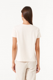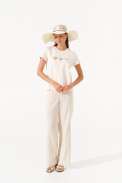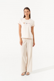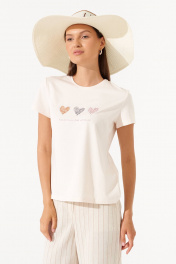 Этот стильный джемпер из мягкого хлопка станет идеальным дополнением вашего весенне-летнего гардероба. Нежные оттенки и милый принт на груди придают модели женственность и лёгкость. Цвет: актуальный и практичный, который легко сочетается с другими элементами гардероба; Материал: мягкий хлопок — натуральная, дышащая ткань, обеспечивающая комфорт в течение всего дня; Дизайн: классический крой с короткими рукавами и круглым вырезом, дополненный оригинальным принтом с сердечками; Универсальность: отлично сочетается с брюками, юбками, джинсами и шортами, подходит для создания как повседневных, так и стильных луков. Идеальный выбор для тех, кто ценит комфорт, стиль и лёгкость! Эта футболка станет любимой вещью в вашем гардеробе.