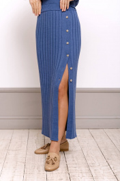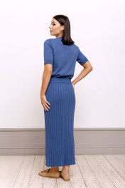 Юбка прямого силуэта,длинная, связана чередованием лицевых и изнаночных петель(имитация плиссе).Используется пряжа, в состав которой входит хлопок 50%, ПАН 50% .Посадка юбки высокая,линия талии подчёркивается с помощью прикеттлеванного пояса, во внутрь которого вставлена эластичная тесьма.В качестве украшения слева по переду сделана имитация застёжки на петли и пуговицы._x000D_