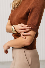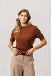 Этот элегантный и универсальный джемпер станет отличным выбором для вашего гардероба! Он идеально подходит для создания лёгких и модных луков, сочетая в себе комфорт, стиль и универсальность. Такой наряд отлично впишется в повседневный стиль, офисные будни или прогулки по городу. Описание топа: Цвет: молочный (шоколадный), который добавляет образу свежесть и лёгкость; Дизайн: джемпер с короткими рукавами и округлым вырезом горловины. Лаконичный крой и мягкая текстура придают изделию женственность и универсальность; Материал: лёгкая и приятная на ощупь трикотажная ткань, которая обеспечивает комфорт в течение всего дня. С чем носить: Джемпер отлично дополнят солнцезащитные очки, как на фото, стильные серьги и сумка нейтрального оттенка. Для завершения образа подойдут туфли на каблуке, лодочки или стильные сандалии. Яркий шарф или платок добавит образу оригинальность. Уход за изделием: Джемпер рекомендуется стирать в деликатном режиме при температуре до 30°C. Не использовать отбеливатели. Сушить в расправленном виде, избегая прямых солнечных лучей.
