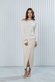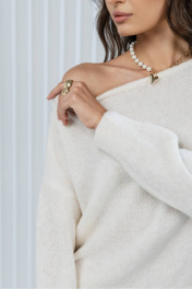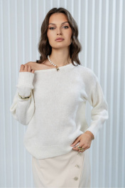 Джемпер прямого силуэта с заниженной линией плеча. Рукав рубашечный длинный . Джемпер очень мягкий и приятный к телу, вывязан переплетением кулирная гладь.Низ изделия и низ рукава связаны переплетением ластик 1*1. Вырез горловины в виде "лодочки".