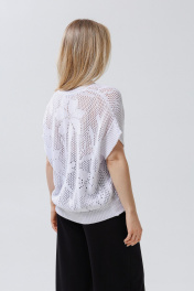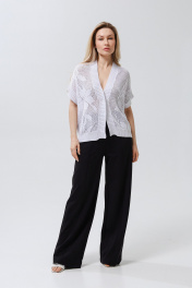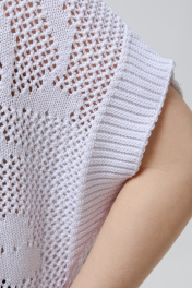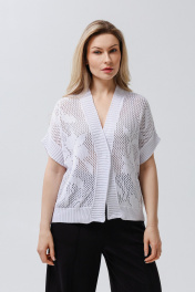 Этот стильный жилет из лёгкой ажурной ткани станет идеальным дополнением вашего гардероба. Цвет придаёт модели свежесть и универсальность, а оригинальный ажурный узор добавляет изысканности и женственности. Жилет выполнен с короткими рукавами и V-образным вырезом, что делает его удобным и стильным элементом одежды.Жилет можно надеть поверх лёгкой блузки или футболки, дополнив стильными брюками или юбкой, чтобы создать завершённый и модный образ. Он отлично сочетается с изысканной бижутерией и туфлями на каблуке для вечернего выхода или с кроссовками для повседневного лука.