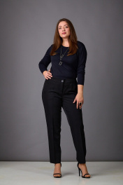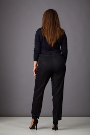 Комплект женский, состоящий из жакета и брюк, выполнен из стрейчевой костюмной ткани на подкладке. Жакет полуприталенного силуэта с рельефами по переду и спинке, отрезной по линии талии, с баской. Карманы-эмитация. Воротник - пиджачного типа. Рукава - втачные, двухшовные. Застежка на 2 пуговицы. Брошь ручной работы съемная. Брюки слегка заужены к низу, с поясом. Посадка-средняя. Застегиваются на молнию по переду и одну пуговицу.