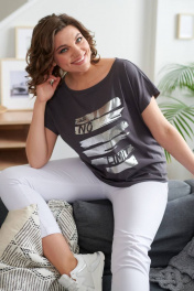 Футболка из трикотажной хлопковой ткани, со спущенным рукавом. На полочке расположен цветной принт. Вырез горловины круглый, оформлен бейкой. Длина изделия: 60 см ±1.0 Длина рукава от основания шеи: разм. 46-52: 23 см ±1.0, разм. 54-60: 25 см ±1.0 Печать: фольга ""серебро"" (Надпись: ""No Limit"" - Без ограничений)