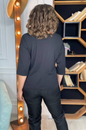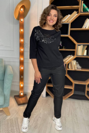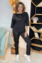 Блузка прямого силуэта со спущенным плечом, из трикотажной ткани. Спинка со средним швом. По полочке расположен принт.Рукав 3/4.. Вырез горловины ""лодочка"". Длина изделия по спинке 58 ± 1 см. Длина рукава от крайней точки плеча 52 см