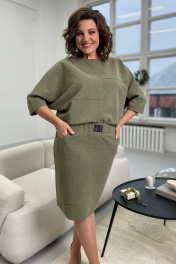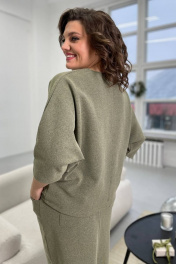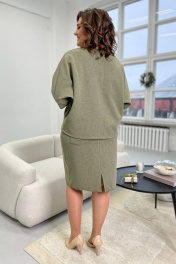 Джемпер женский из трикотажной ткани,свободного силуэта . Перед и спинка джемпера оформлены настрочными швами с открытыми срезвами. Рукав цельнокроенный, вырез горловины-круглый,оформлен бейкой. Длина изделия по среднему шву спинки 63±1 Длина рукава от крайней точки плеча 53±1 Юбка женская прямого силуэта из трикотажной ткани.По переду расположены карманы с настрочными швами с открытыми срезами. Задняя половинка юбки со средним швом ,заканчивающимся разрезом,какеткой и накладными карманами. Верх юбки оформлен поясом ,в пояс вставлена резинка. Длина издели по боковому шву с учетом пояса 60±1 см