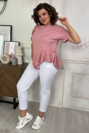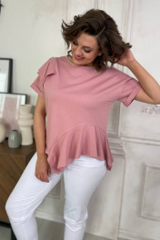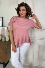 Джемпер женский из трикотажной ткани ,прямого силуэта. По низу переда подрез с валаном. На правом плече настрочен валан. Спинка со средним швом. Рукав короткий. Спущенное плечо. Низ изделия и валанов не обработан. Вырез горловины лодочка.Обработан притачной бейкой. Длина изделия по спинке 60 ± 1см Длина рукава от крайней точки плеча 36 ± 1.