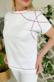 Джемпер женский из трикотажной ткани, прямого силуэта. По полочке настрочен нагрудный карман и расположены декоративные строчки "мультиколор голубой". Спинка со средним швом, спущенное плечо. Пройма обработана притачной манжетой. Вырез горловины "лодочка". Низ джемпера и шов притачивания бейки прострочены декоративным швом "мультиколор голубой". Промеры на примере 52 размера: Обхват груди: 114 см (спущенное плечо), обхват бедер: 113 см. Длина плечевого шва от крайней точки шеи: 28 ±1.0см. Длина изделия по среднему шву спинки: 65 ±1.0см Брюки на модели: 2023 белый