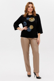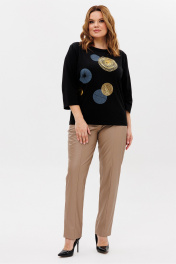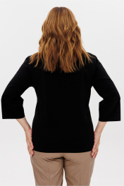Джемпер женский из трикотажной ткани. По переду расположен принт. Рукав втачной, одношовный 3/4. Вырез горловины круглый, оформлен притачной бейкой. Рекомендации по уходу: стирка и глажка с изнаночной стороны. Промеры на примере 50 размера: ОГ - 106 см, ОБ - 110. Длина рукава - 45 см. Длина изделия по спинке - 63 см.