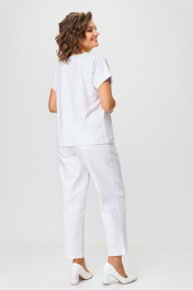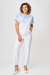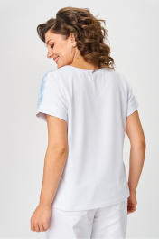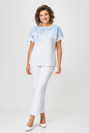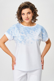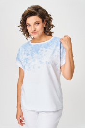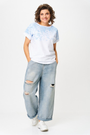 Джемпер из трикотажной хлопковой ткани. Перед футболки с принтом. Спущенное плечо, оформлено притачной манжетой. Вырез горловины круглый, оформлен бейкой. Спинка без среднего шва. Промеры на примере 52 размера: ОГ 116 (спущенное плечо), ОБ 116, длина по спинке 61,5 см. Длина рукава от основания шеи: 27 см Длина по спинке в 56р: 64 см Длина рукава от основания шеи в 56р: 29 см