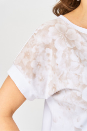 Джемпер из трикотажной хлопковой ткани. Перед футболки с принтом. Спущенное плечо, оформлено притачной манжетой. Вырез горловины круглый, оформлен бейкой. Спинка без среднего шва. Промеры на примере 52 размера: ОГ 116 (спущенное плечо), ОБ 116, длина по спинке 61,5 см. Длина рукава от основания шеи: 27 см Длина по спинке в 56р: 64 см Длина рукава от основания шеи в 56р: 29 см