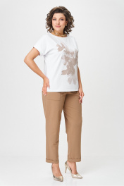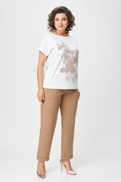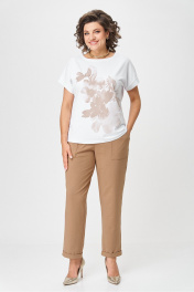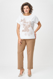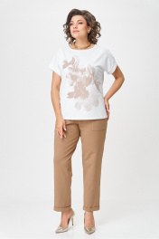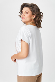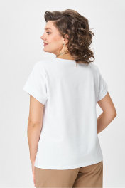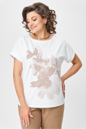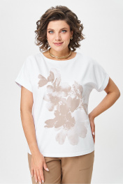 Джемпер из трикотажной хлопковой ткани. Перед футболки с принтом. Спущенное плечо, оформлено притачной манжетой. Вырез горловины круглый, оформлен бейкой. Спинка без среднего шва. Промеры на примере 52 размера: ОГ 116 (спущенное плечо), ОБ 116, длина по спинке 61,5 см. Длина рукава от основания шеи: 27 см Длина по спинке в 56р: 64 см Длина рукава от основания шеи в 56р: 29 см