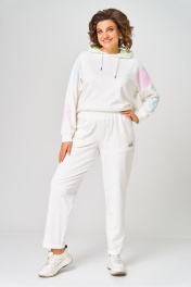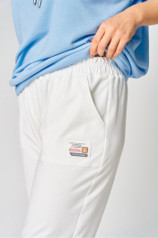 Брюки женские из трикотажной ткани (двунитка), слегка заужены к низу. По переду брюк расположены накладные карманы. На левом кармане настрочной декоративный элемент. В пояс вставлена резинка по кругу. Длина изделия: с учетом пояса -102±1 см. Промеры на примере 52 размера. ОТ-80см (в свободном состоянии резинки), ОБ-116см, ширина брюк снизу 1/2-21см.