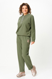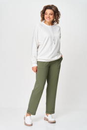 Брюки женские из трикотажной ткани (двунитка), слегка заужены к низу. По переду брюк расположены накладные карманы. На левом кармане настрочной декоративный элемент. В пояс вставлена резинка по кругу. Длина изделия: с учетом пояса -102±1 см. Промеры на примере 52 размера. ОТ-80см (в свободном состоянии резинки), ОБ-116см, ширина брюк снизу 1/2-21см. Состав комплекта: 90% хлопок, 10% эластан. Рост: 170 см На модели джемпер: 2270