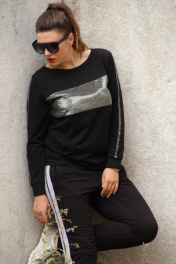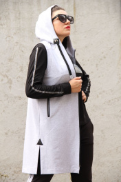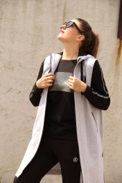 Комплект тройка. Жилет прямого силуэта с разрезами по бокам. Прорезные карманы по переду. Майка прямого силуэта, комбинированная двумя видами тканей. Брюки заужены к низу с карманами на молнии. Брюки: длина 103 см. Длина жилета - 92 см. Длина майки - 58 см. Длина рукава - 23 см.