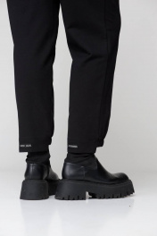 Комплект женский из 3 предметов с курткой. Куртка прямого кроя, с капюшоном и накладными карманами. Плечо спущенное, застежка по переду на кнопки. Рукав втачной. Джемпер прямой из 2 видов ткани. Воротник стойка. Брюки с фигурными подрезами и карманами.