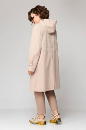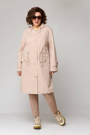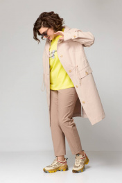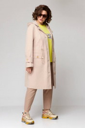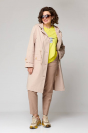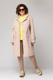 Стильный демисезонный комплект в нежных оттенках состоит из 3 предметов. Плащ прямого силуэта с втачным двухшовным рукавом. По переду карманы с клапаном. Застежка центральная на петли и пуговицы. По спинке средний шов со шлицей. По талии кулиска застегивается шнуром. Майка полуприлегающего силуэта с круглой горловиной. Рукав укороченный, на полочке термопечать. Брюки прямого кроя немного заужены к низу, по боковому отрезная деталь в виде лампаса из основной ткани. Карманы в боковом шве, по низу вытачки, на задней половинке отрезная фигурная кокетка. Пояс на резинке.