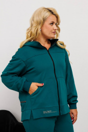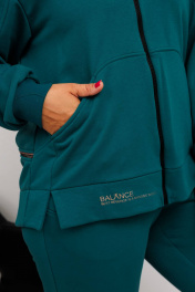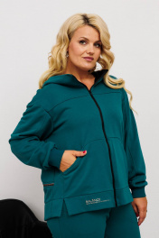 Модный женский костюм из дресс трикотажа. Ветровка прямого силуэта с длинным рукавом до линии бедер. На уровне бедер прорезные карманы с листочкой. Горловина оформлена капюшоном, рукав длинный втачной. Спинка отрезная фигурная с декоративной тесьмой по линии талии и длиннее чем передняя. Застежка центральная на тесьму-молнию. По переду дизайнерская аппликация. Брюки спортивные имеют свободный силуэт с высокой посадкой и с боковыми карманами, по низу с манжетой на резинке. Пояс притачной на резинке.