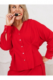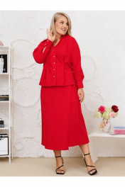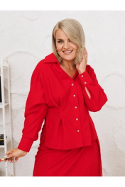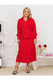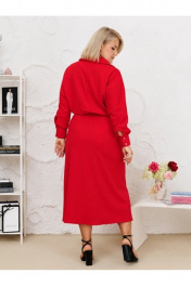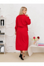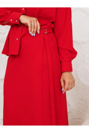 Оригинальное платье ( имитация блузки и юбки ) отрезное по линии талии с цельнокроеным рукавом. По низу рукава складки собраны на манжету с застежкой на 2 пуговицы. Воротник рубашечного типа с притачной стойкой. Застежка центральнобортовая в верхней части на 5 пуговиц. Верхняя часть спинки свободная, со средним швом и присобрана на притачной к нижней, расширенной к низу части. Нижняя часть-Юбка на запах с застежкой на потайную пуговицу и пряжкой на верхней половинке. Платье можно носить в 3 вариациях, разрез юбки регулировать с помощью пояса, заправлять блузон или на выпуск.