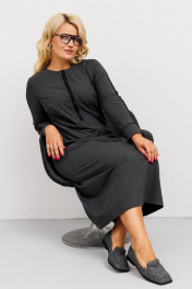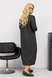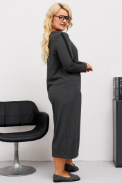 Комплект женский состоит из жакета свободного прямого силуэта и платья. Платье полуприлегающего силуэта с круглой горловиной и с одношовным втачным рукавом, внизу на манжете. Верхняя часть переда с центрально бортовой застежкой на кнопки, нижняя часть с вертикальными вытачками, образующими о-образный силуэт низу, Куртка со спущенным плечом, с одношовным рукавом и втачным воротником на подкройной стойке. Застежка центрально бортовая на пуговицы до линии пергиба лацкана. Перед с накладными рабочими карманами и клапанами.