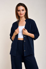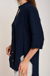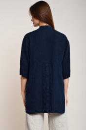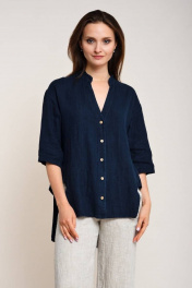 Рубашка женская свободного кроя со спущенной линией плеча, прямого силуэта . Застежка - фигурная планка спереди на петли и пуговицы, воротник-стойка, рукав втачной. По спинке отрезная кокетка и застроченная встречная складка. В качестве отделки в боковом шве декоративный элемент в форме треугольника 42размер :ПОГ 48см ;44размер:ПОГ 50см; 46размер:ПОГ 52см; 48размер :ПОГ 54см; 50размер:ПОГ 56см;52размер:ПОГ 58см; 54размер:ПОГ 60см; 56размер:ПОГ 62см. Длина 80 см спина, 62 см перед