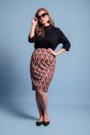 Юбка прилегающего силуэта, выполнена из трикотажного полотна с люрексом, на подкладке. Застёжка на потайную тесьму-молнию в среднем шве спинки, по низу шлица 22 см. Верхний срез обработан поясом 3,5 см, по боковым вставлена резинка. 54 р: ОТ 82 см (резинка растягивается до 90 см), ОБ 110 см, 56 р: ОТ 88 см (резинка растягивается до 102 см), ОБ 118 см, 58 р: ОТ 92 см (резинка растягивается до 106 см), ОБ 120 см.