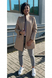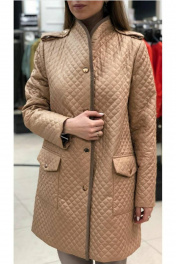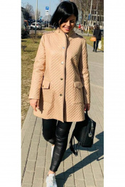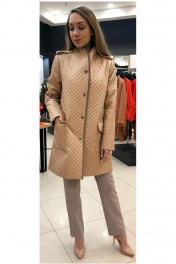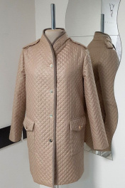 Тренч женский, прямого силуэта. Изготовлен из плащевой стеганой ткани, бежевого цвета. Имеет застёжку спереди на кнопки. Воротник стойка, декоративная окантовка вельветом по борту. Длина до калена. Карманы накладные, квадратной формы.паноны по линии плеча.