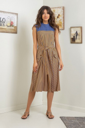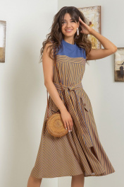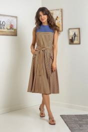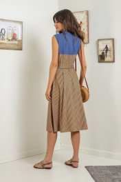 Платье полуприлегающего силуэта, длиной до середины икры, расширенное к низу. Платье по спинке и по переду с кокеткой из отделочной ткани. Спинка платья с талиевыми вытачками и средним швом, в котором обработана застёжка на потайную тесьму-«молнию». По переду обработаны прорезные карманы с клапанами, и на них пришиты декоративные пуговицы. По горловине воротник – «стойка». Платье дополняет мягкий пояс из основной ткани. Длина по спинке 44-48р=113,0см 50р=115,0см