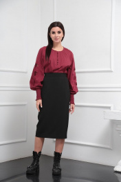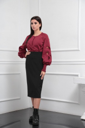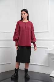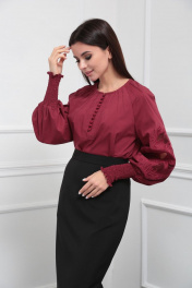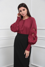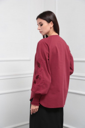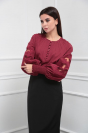 Блузка женская из лёгкой хлопковой ткани, прямого силуэта. Оригинальна в исполнении с художественной вышивкой по рукавам. По центру переда планка на 11 петель и столько же пуговиц. Рукав реглан, по низу рукава манжета присборена на эластичную тесьму (венгерку) для фиксации. Горловина округлой формы, по горловине изделия декоративные защипы .