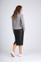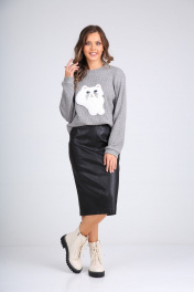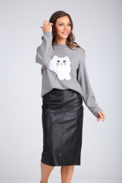 Джемпер женский прямого силуэта, нарядный, из мягкой ткани. Полочка и спинка цельнокроенные. Плечо спущенное, рукав втачной. По низу рукава – манжета, по низу изделия – притачной пояс. Горловина округлой формы. По переду красивая дизайнерская вышивка "котенок".