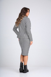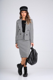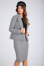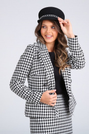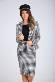 Жакет, полуприлегающего силуэта из костюмной ткани, длиной выше линии бедер, с воротником пиджачного типа, без застёжки, с рукавами, длиной до запястья. Жакет на подкладке. Передние половинки с нагрудными вытачками из шва притачивания бочка, бочки отрезные от среза пройм до низа.Спинка со средним швом, отрезными бочками от среза пройм до низа.Рукава втачные, двухшовные, без особенностей. Концы воротника, лацканов и нижние края бортов – прямые, в шов обтачивания борта, отлёта и уступа лацкана, отлёта воротника втачивается отделочная деталь с вытрепанным краем. На детали переда пришиты два ряда отделочных пуговиц, как имитация двубортной застёжки.пуговицы в жакете могут быть отличными от фотографии Юбка: переднее полотнище с вытачками. Заднее полотнище с вытачками и средним швом на застежку-молнию. Юбка со шлицей.На подкладке Изделие идет строго размер в размер.