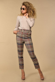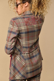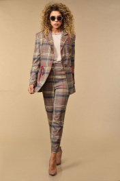 Костюм состоит их жакета и брюк в клетку. Жакет с центральной застежкой на одну пуговицу. По талии кулиса со шнурком. По спинке и полочке декоративная вышивка. На рукавах по низу отлетная шлица с пуговицами. Жакет на подкладке. Воротник с отрезной стойкой. В брюках застежка на молнию и пуговицу. По поясу частичная резинка и шлевки. Карманы в боковых швахи позаднему полотнищу. Длина изделия – 70 см, длина рукава – 61 см, длина брюк- 98 см.