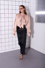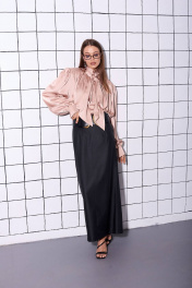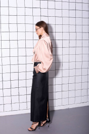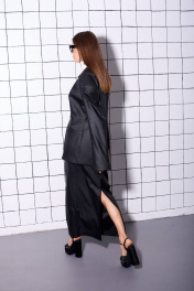 Юбка-макси изготовлена из искусственной кожи, на подкладке. На заднем полотнище, расположен разрез и потайная застежка на молнию. Замеры: длина: 98см