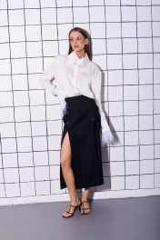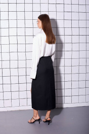 Юбка прямого силуэта, длина миди, с двумя разрезами по переду и декоративными пуговицами. Застежка по спинке на потайную молнию. Замеры: длина: 85см