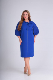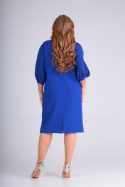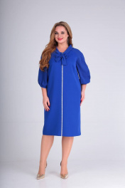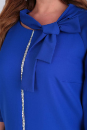 Платье женское, свободного кроя. Выполнено из костюмно-плательной ткани. Перед с двумя нагрудными вытачками. Горловина округлой формы с дополнительной стойкой, переходящей в завязку. Рукав реглан, состоит из пышной формы на манжете. Ткань тянется (легкий стрейч). Спинка платья разрезная по среднему шву, заканчивается разрезом. Длина изделия по спинке 103 см. Длина рукава от горловины 51 см.
