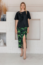 Блуза свободного прямого силуэта. Перед блузы выполнен из льна, спинка из трикотажного полотна. Спинка блузы цельнокроенная. Рукав короткий, также из трикотажного полотна. Спереди - асимметричный рельеф с воланом. Горловина обработана окантовкой , переходящей в завязывающиеся шнурки. На спинке, по горловине, вдоль детали, заложена складка для большей свободы блузы. Длина блузы по центру спинки - 60,0 см - для всех ов. Длина рукава - 28,0 см - для всех ов. Ширина на уровне груди ( половина) - 46 р -53,0 см., 48 р -55,0 см. Ширина на уровне низа изделия (половина) - 46 р -58,0 см., 48 р - 60,0 см. Ширина рукава по низу (половина) - 46 р - 23,5 см., 48 р -24,5 см. Выполнена блуза из натуральных материалов - льна, производства Беларусь и трикотажного вискозного полотна, производства Турции. Блузу можно носить ежедневно.