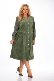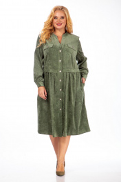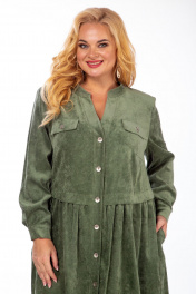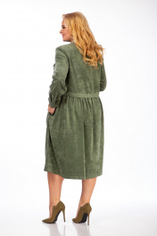 Силуэт полуприлегающий, расширенный к низу. Рукав втачной, одношовный . Низ рукава со складками и на манжете с застёжкой на пуговицу. Длина рукава 59 см. Горловина круглая, оформлена отрезной плосколежащей стойкой. Перед с отрезной застёжкой до низа на пуговицы. Полочки с нагрудными вытачками. Вверху полочек настрочены клапаны, которые декорированы пуговицами. Платье на уровне талии отрезное. По линии подреза заложена отлетная складка. По нижней части платья выполнена сборка. На уровне бёдер в боковых швах выполнены потайные карманы. Длина платья по спинке 113 см. Платье выполнено из костюмно-плательной ткани (велюр). 60 р. ПОГ 64 ПОБ 88